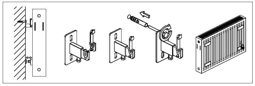 für Heizkörper mit Aufhängelaschen, zu empfehlen für den Einsatz in öffentlichen Bauten, höhen- und tiefenverstellbare Konsole, hohe Belastungswerte durch Vollmaterialkonstruktion, große Wandauflage, um 180° drehbar zu montieren, Aushebesicherung, Metallteile verzinkt, schallisolierend, solide Anschraubplatte 65 x 110 x 3 mm
