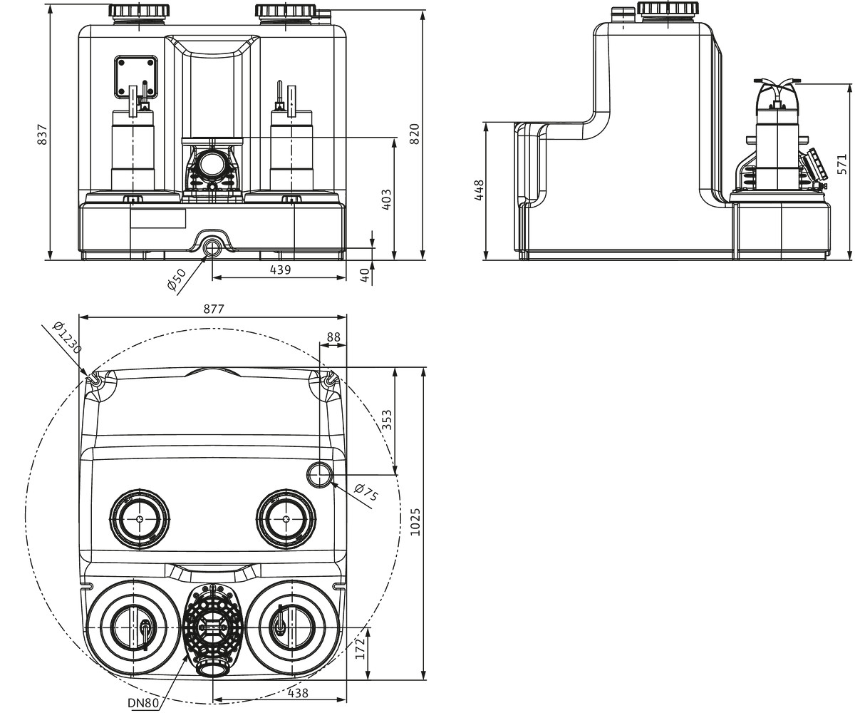 anschlussfertige, vollüberflutbare Doppelpumpen-Hebeanlage zur Förderung von fäkalienhaltigem Abwasser, für die rückstausichere Entwässerung, wenn die Ablaufstelle unterhalb der Rückstauebene liegt, zwei Kugeldurchgangsgrößen (44/65 mm), bestehend aus Hebeanlage mit Schaltgerät und Anschlusskabel mit Stecker, Flanschstutzen DN 80 (90 mm)/DN 100 (110 mm), Manschette DN 100 (110 mm) für Druckanschluss, HT-Doppelmuffe DN 65 (75 mm) für Entlüftungsanschluss, HT-Doppelmuffe DN 40 (50 mm) für Entleerungsanschluss, Zulaufset mit Lochsäge 175 mm (7 Zoll) und Dichtung DN 150 (160 mm), Bodenbefestigungsset, Akku 9 V, Einbau- und Betriebsanleitung, 50 Hz, Typ M523/4-CEE mit Netzstecker CEE 32A, 1P+N+PE, 6h, Typ T540/4-CEE mit Netzstecker CEE 32A, 3P+N+PE, 6h, Typ M523/1-EF und M523/4C-EF mit Netzstecker CEE 7/7, Typ T540/1-CEE mit Netzstecker CEE 16A, 3P+N+PE, 6h, Typ M523/1-CEE mit Netzstecker CEE 32A, 1P+N+PE, 6h