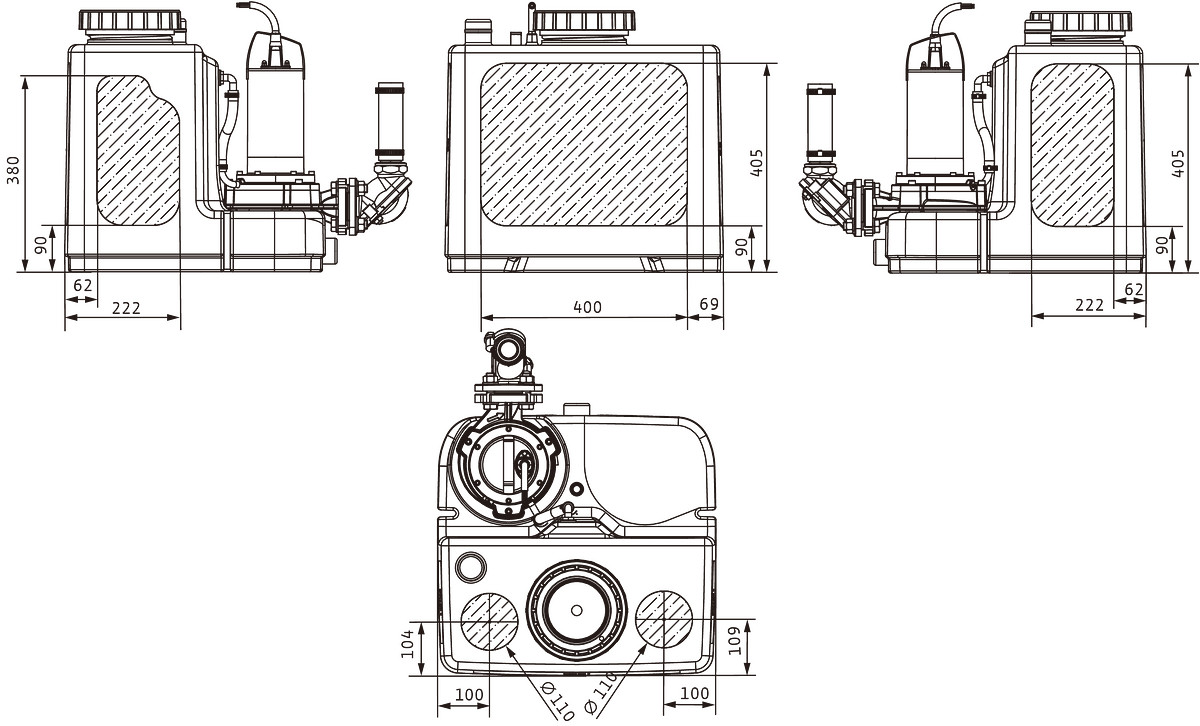 anschlussfertige, vollüberflutbare Einzelpumpen-Hebeanlage mit Schneidwerkhydraulik zur Förderung von fäkalienhaltigem Abwasser, Förderung von fäkalienhaltigem Abwasser, großes Schaltvolumen, Pumpe mit radialem Schneidwerk mit Doppelschereneffekt, thermischen Motorschutz und netzunabhängigem Alarm, Hydraulik/Schneidwerk-Kombination für eine breite Abdeckung von Förderhöhen bei niedrigsten Leistungsanforderungen für haustechnische Elektroinstallationen, frei wählbare Anschlüsse für maximale Montageflexibilität, bestehend aus vollüberflutbare Hebeanlage mit Schneidwerk, Schaltgerät und Anschlusskabel mit Stecker, Rohranschluss DN 32 (Außendurchmesser 40 mm), HT-Doppelmuffe DN 40 (50 mm) für Entlüftungsanschluss, HT-Doppelmuffe DN 40 (50 mm) für Entleerungsanschluss, Zulaufset mit Lochsäge 124 mm (5 Zoll) und Dichtung DN 100 (110 mm), Bodenbefestigungsset, Schallschutzmatte, Akku 9 V, Einbau- und Betriebsanleitung