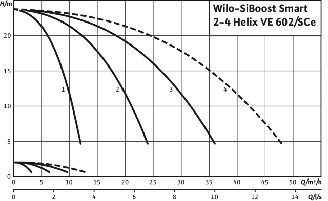 Anschlussfertige Wasserversorgungsanlage mit 2-4 parallel geschalteten, vertikal angeordneten, Edelstahl-Hochdruck-Kreiselpumpen, normalsaugend, der Baureihe Helix VE, mit integriertem luftgekühlten Frequenzumrichter, mit Smart Controller, zum Einsatz für vollautomatische Wasserversorgung und Druckerhöhung im Zulaufbetrieb aus dem öffentlichen Wassernetz oder einem Tank für private, kommerzielle, industrielle und kommunale Anwendungen (z. B. Wohngebäude, Büro, Verwaltungsgebäude, Hotels, Krankenhäuser, Handwerk, Industrie, Wasserversorgungsunternehmen), Reservepumpe gemäß DIN 1988 und DIN EN 806 enthalten, zugelassene Fördermedien sind normalerweise Wasser, die die verwendeten Werkstoffe nicht angreifen (weder chemisch noch mechanisch) und keine abrasiven oder langfaserigen Bestandteile aufweisen wie Trinkwasser, Kühlwasser, Prozesswasser, Löschwasser (außer für Feuerlöschanlagen gemäß DIN 14462 und mit Genehmigung der örtlichen Brandschutzbehörden), mit Einbau- und Betriebsanleitung, integrierter Überlastschutz, Trockenlaufschutz und Wassermangelsicherung, mit automatischer Abschaltung