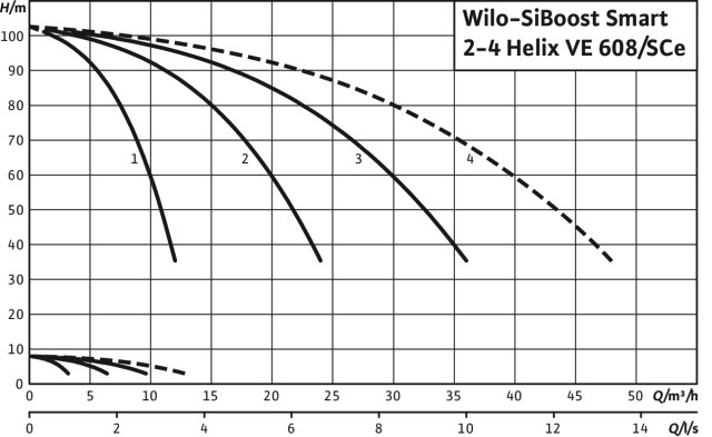 Anschlussfertige Wasserversorgungsanlage mit 2-4 parallel geschalteten, vertikal angeordneten, Edelstahl-Hochdruck-Kreiselpumpen, normalsaugend, der Baureihe Helix VE, mit integriertem luftgekühlten Frequenzumrichter, mit Smart Controller, zum Einsatz für vollautomatische Wasserversorgung und Druckerhöhung im Zulaufbetrieb aus dem öffentlichen Wassernetz oder einem Tank für private, kommerzielle, industrielle und kommunale Anwendungen (z. B. Wohngebäude, Büro, Verwaltungsgebäude, Hotels, Krankenhäuser, Handwerk, Industrie, Wasserversorgungsunternehmen), Reservepumpe gemäß DIN 1988 und DIN EN 806 enthalten, zugelassene Fördermedien sind normalerweise Wasser, die die verwendeten Werkstoffe nicht angreifen (weder chemisch noch mechanisch) und keine abrasiven oder langfaserigen Bestandteile aufweisen wie Trinkwasser, Kühlwasser, Prozesswasser, Löschwasser (außer für Feuerlöschanlagen gemäß DIN 14462 und mit Genehmigung der örtlichen Brandschutzbehörden), mit Einbau- und Betriebsanleitung, integrierter Überlastschutz, Trockenlaufschutz und Wassermangelsicherung, mit automatischer Abschaltung