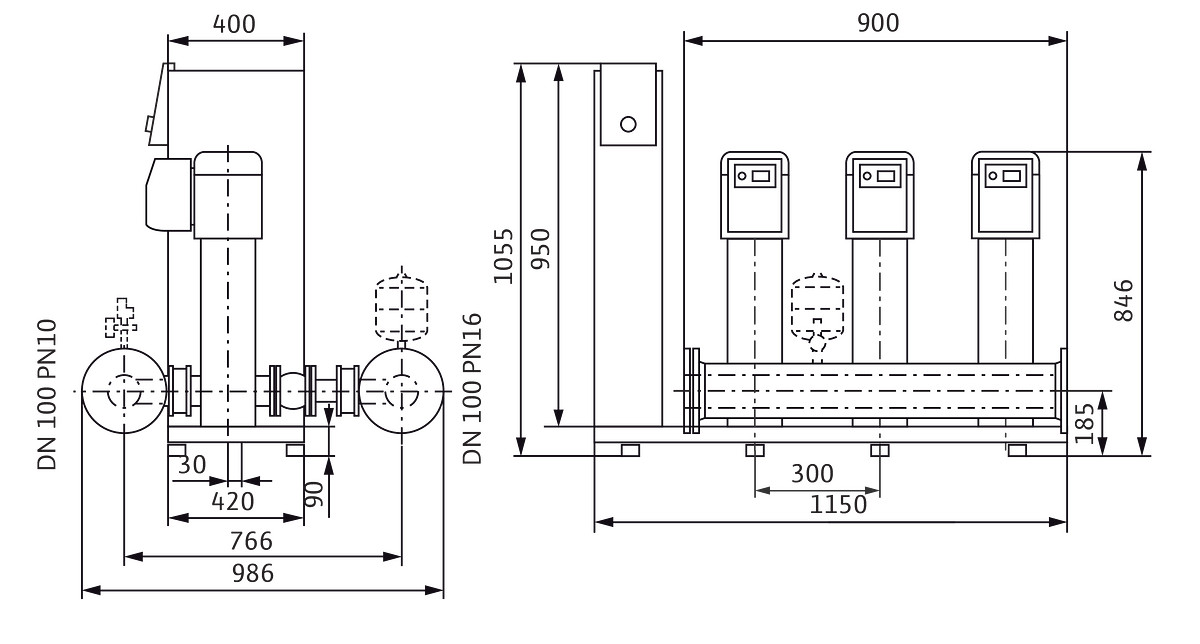 Anschlussfertige Wasserversorgungsanlage mit 2-4 parallel geschalteten, vertikal angeordneten, Edelstahl-Hochdruck-Kreiselpumpen, normalsaugend, der Baureihe Helix VE, mit integriertem luftgekühlten Frequenzumrichter, mit Smart Controller, zum Einsatz für vollautomatische Wasserversorgung und Druckerhöhung im Zulaufbetrieb aus dem öffentlichen Wassernetz oder einem Tank für private, kommerzielle, industrielle und kommunale Anwendungen (z. B. Wohngebäude, Büro, Verwaltungsgebäude, Hotels, Krankenhäuser, Handwerk, Industrie, Wasserversorgungsunternehmen), Reservepumpe gemäß DIN 1988 und DIN EN 806 enthalten, zugelassene Fördermedien sind normalerweise Wasser, die die verwendeten Werkstoffe nicht angreifen (weder chemisch noch mechanisch) und keine abrasiven oder langfaserigen Bestandteile aufweisen wie Trinkwasser, Kühlwasser, Prozesswasser, Löschwasser (außer für Feuerlöschanlagen gemäß DIN 14462 und mit Genehmigung der örtlichen Brandschutzbehörden), mit Einbau- und Betriebsanleitung, integrierter Überlastschutz, Trockenlaufschutz und Wassermangelsicherung, mit automatischer Abschaltung
