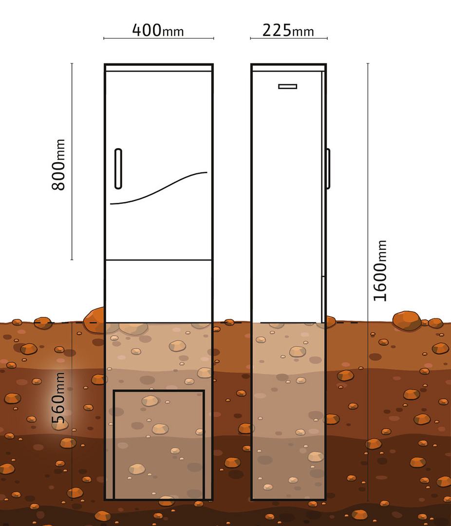 für die Außenaufstellung aus glasfaserverstärktem Kunststoff (SMC), besteht aus einem leeren, selbstragenden Gehäuse mit angepressten Halterungen für die Sammelschienen und einem Sockel für die Bodenaufstellung, Seitenteile sind durchgehend (Gehäuse und Sockel)