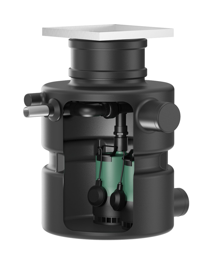 zwei integrierte Pumpen mit Rückschlagklappe, Abdeckung mit Bodenablauf und Fliesenrahmen, Steuerung der Pumpen über ein Schaltgerät und separaten Schwimmer, zur Förderung von vorgereinigtem Abwasser ohne Fäkalien (nach DIN EN 12050-2), welches nicht über das natürliche Gefälle dem Kanalsystem zugeführt werden kann, Pumpe mit angebautem Schwimmerschalter im Kunststoffbehälter zum Unterflureinbau, mit installierter Druckleitung und Rückschlagklappe, Pumpenkabel (5 m bzw. 10 m lang) mit angebautem Schutzkontakt-Stecker