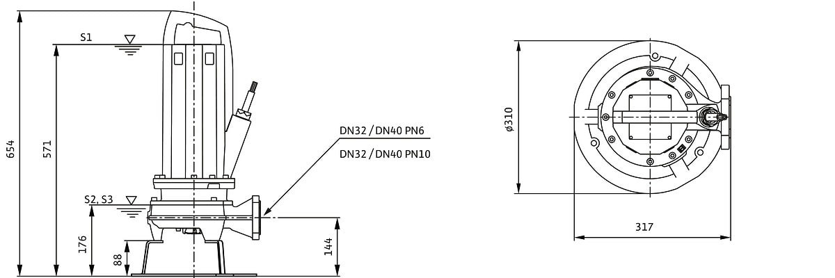vollüberflutbare Schneidwerkpumpe für die stationäre und transportable Nassaufstellung im Dauerbetrieb, radiales Schneidwerk mit Doppelschereneffekt, Hydraulik/Schneidwerk-Kombination, Motor mit zwei Gleitringdichtungen und optionaler Überwachung der Dichtungskammer, zur Förderung in gewerblichen Bereichen von Abwasser mit Fäkalien und Schmutzwasser (mit geringen Mengen Sand), erfüllt die Anforderungen nach DIN EN 12050-1, DN 32/40, Betriebsart (ausgetaucht) S2-30 Min. / S3-25%, Anschlusskabel 10 m
