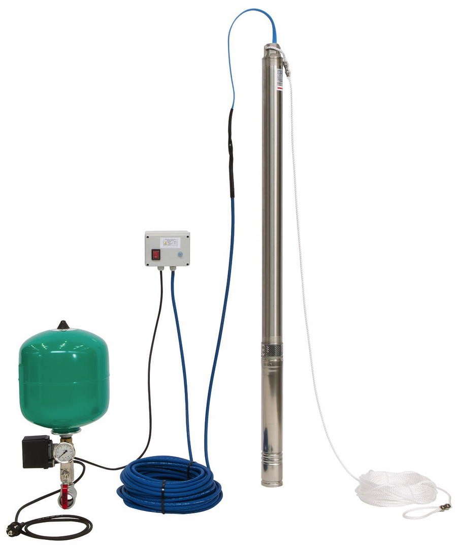 Wasserversorgungsanlage mit Unterwassermotor-Pumpe, Steuerung und Zubehör, zur Wasserversorgung aus Bohrlöchern, Brunnen und Zisternen, privaten Wasserversorgung, Beregnung und Bewässerung, Förderung von Wasser ohne langfasrige und abrasive Bestandteile, Wilo-Plug & Pump-Paket Sub-I zur Gartenbewässerung von privaten Grünanlagen im häuslichen Bereich, komplett montiert, mit 30 m Anschlusskabel mit Trinkwasserzulassung (Querschnitt 4 x 1,5 mm2), Schaltkasten mit Kondensator, Ein-/Ausschalter, Wilo-Hicontrol 1 (FC), automatischer Strömungs- und Druckwächter mit integriertem Trockenlaufschutz, 30 m Halteseil, Einbau- und Betriebsanleitung, Wilo-Plug & Pump-Paket Sub-II zur Eigenwasserversorgung von Ein- und Mehrfamilienhäuser komplett montiert, mit 30 m Anschlusskabel mit Trinkwasserzulassung (Querschnitt 4 x 1,5 mm2), Schaltkasten mit Kondensator, Ein-/Ausschalter, Wilo-Druckschaltung 0-10 bar mit 18 l Membranausdehnungsgefäß, Manometer, Absperrorgan und Druckschalter, 30 m Halteseil, Einbau- und Betriebsanleitung, mediumberührende Teile korrosionsfrei, integrierter Rückflussverhinderer