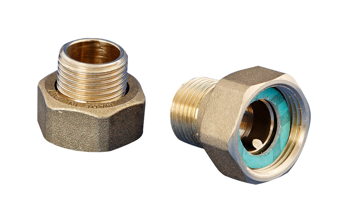 für Trinkwasser-Zirkulationspumpen, Variante A Spezialeinlegeteile mit Whitworth-Außengewinde (DIN EN 10226-1) und Innenbohrung für den wahlweisen Anschluss mit Gewinde oder mit Lötverbindung an Kupferrohr (DIN EN 1057), Variante B Einlegeteile mit Innengewinde zum Anschluss an Kupferrohr (DIN EN 1057) mit Whitworth-Rohrgewinde nach DIN EN 10226-1, 1 Satz Verschraubung besteht aus 2 Überwurfmuttern (GTW chromatiert), 2 Flachdichtungen und 2 Einlegeteilen, Schraub- oder Lötanschluss