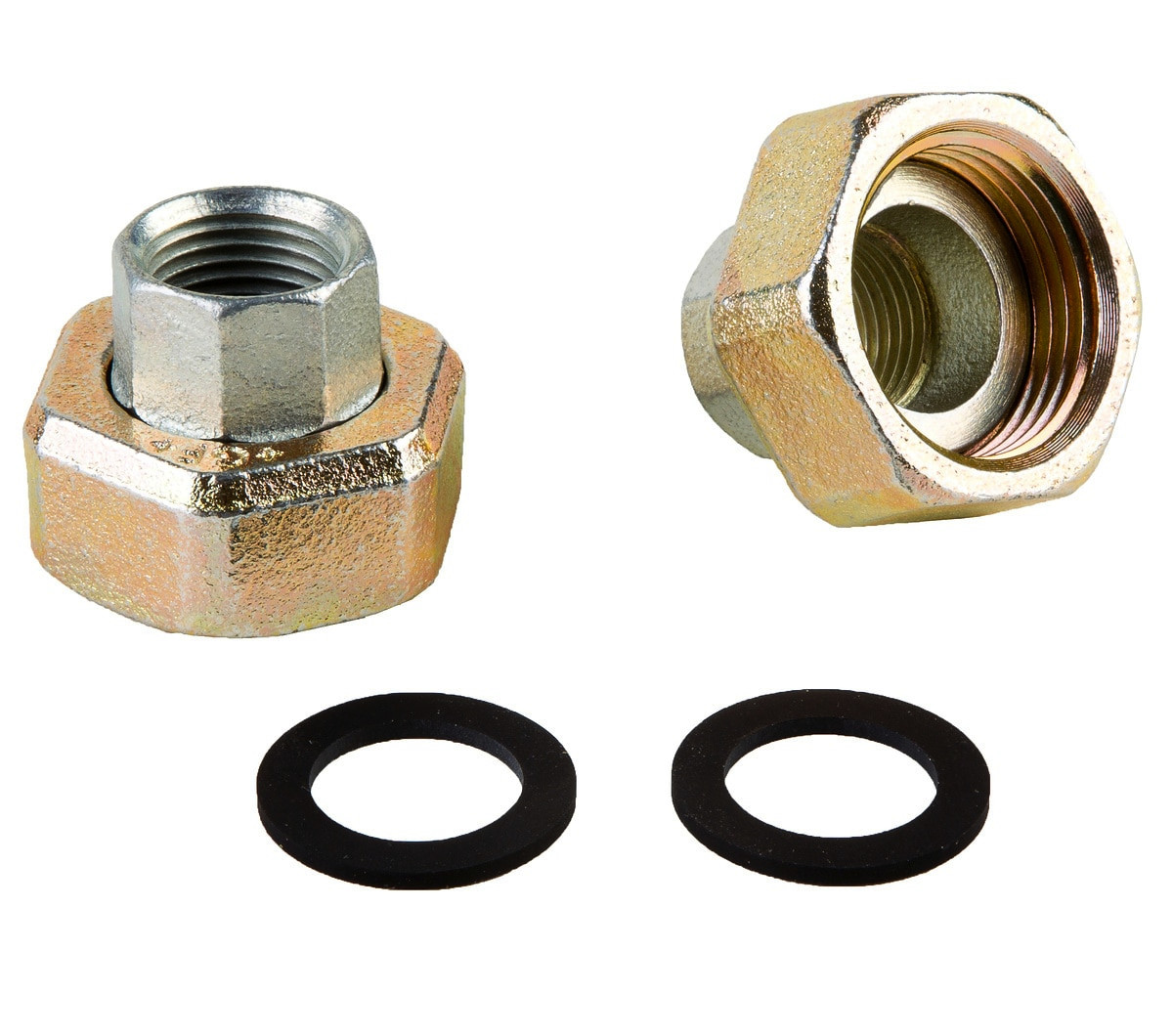 für Trinkwasser-Zirkulationspumpen, Variante A Spezialeinlegeteile mit Whitworth-Außengewinde (DIN EN 10226-1) und Innenbohrung für den wahlweisen Anschluss mit Gewinde oder mit Lötverbindung an Kupferrohr (DIN EN 1057), Variante B Einlegeteile mit Innengewinde zum Anschluss an Kupferrohr (DIN EN 1057) mit Whitworth-Rohrgewinde nach DIN EN 10226-1, 1 Satz Verschraubung besteht aus 2 Überwurfmuttern (GTW chromatiert), 2 Flachdichtungen und 2 Einlegeteilen, Schraub- oder Lötanschluss
