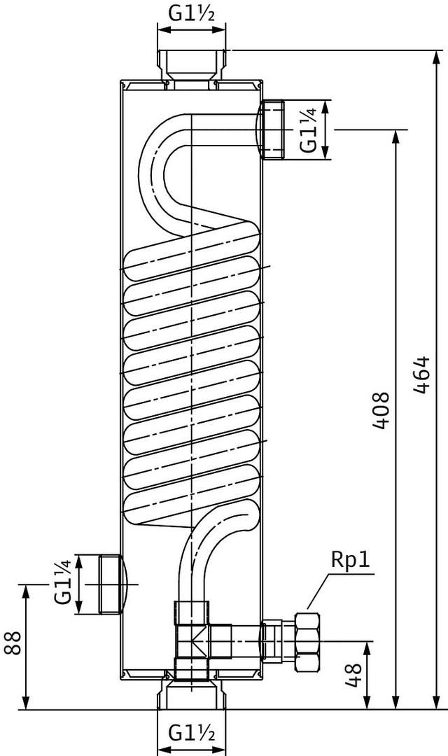 Wärmetauscher der Systemtrennung WS 5-24 Yonos PICO zur Übertragung der im Heizkessel erzeugten Wärme auf den Fußbodenheizkreis, passend auch zu WSG 5 24 Grundeinheit, bestehend aus: Mantel aus Messing (CuZn 36 Pb 2 As), Ø 100 mm außen, geripptes Wendelrohr aus Kupfer (SF-Cu), Ø 22 mm außen, Primärkreislauf (kesselseitig) durch Wendelrohr mit G 11/4" Außengewinde für Vorlauf und G 11/2" für Rücklauf sowie Anschluss Rp 1" für Bypass des 3-Wege Mischers, Sekundärkreis (Fußbodenheizung) durch Mantelraum des Wärmetauschers mit G 11/2" bzw. G 11/4" Außengewinde für Vor und Rücklauf