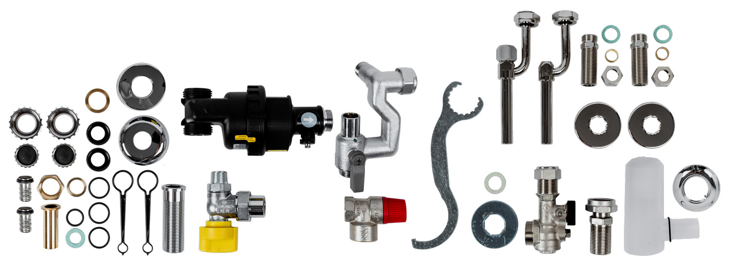 bestehend aus Gaskugelhahn mit thermischer Sicherung, Eckwartungshahn mit KFE-Hahn, Schlammabscheider mit Magnetitabscheider, Verrohrung Rücklauf mit Absperr- und Befüllfunktion, Anschluss für Sicherheitsventil R1/2 und mit Anschluss für Sicherheitsventil R 1/2, Anschlussteil Warmwasser, Anschlussteil Kaltwasser, Sicherheitsventil 3 bar Ansprechdruck, Ablauftrichter