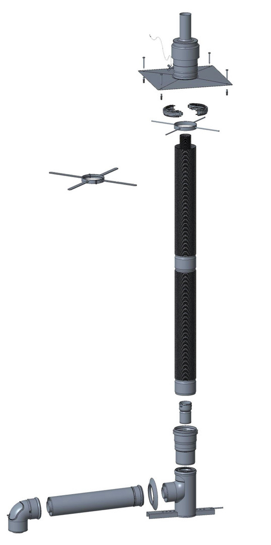 bestehend aus Revisionsbogen bzw. T-Stück konzentrisch 87°, Abgasrohr konzentrisch Länge 1000 mm, Rosette, Stützbogen 87° mit Auflageschiene, Innenrohr: Abgasrohr flexibel, Länge 12,5 m, Aussenrohr: Abgasrohr flexibel, Länge 15,0 m (DN110) bzw. 13x 1000mm (DN125), Befestigung (Halterung) für flexibles Rohr an der Schachtabdeckung und 6 Abstandhaltern, Schachtabdeckung mit integrierter Luft-/Abgasführung und Mündungsstück