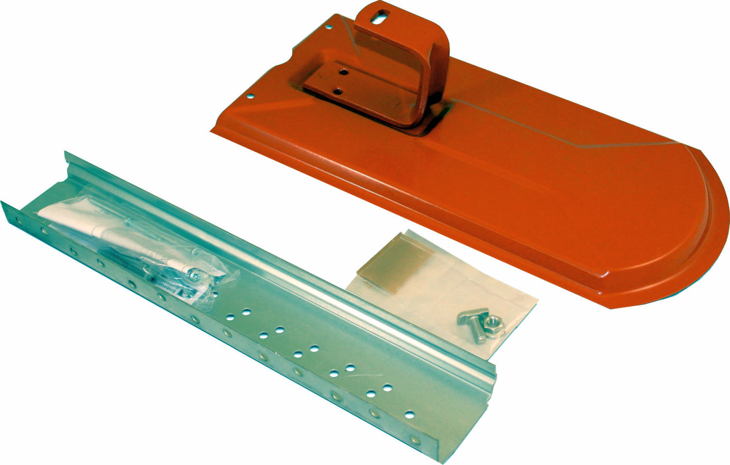 bestehend aus pulverbeschichtetem Blechersatzziegel (RAL 2001, ziegelrot), für Biberschwanz Eindeckung 180 x 380 mm, Verstärkungsschienen, Holzschrauben und Hammerkopfschrauben mit Muttern