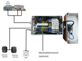 Modul zur elektrischen Ansteuerung von Niedertemperatur-Kesseln mithilfe des Brennersteckers über Wärmepumpen, Eingang Wärmeanforderung von der Wärmepumpen-Inneneinheit, Ausgang für Kesselkreispumpe des Zweitwärmeerzeuger, einstellbarer Kesselkreispumpennachlauf, Schnittstelle zum Zweitwärmeerzeuger über 7-poligen Brennerstecker, Schornsteinfegertaster am Gehäuse, Eingang für Frostschutzthermostat (optional, wenn Kessel oder Versorgungsleitungen frostgefährdet sind)