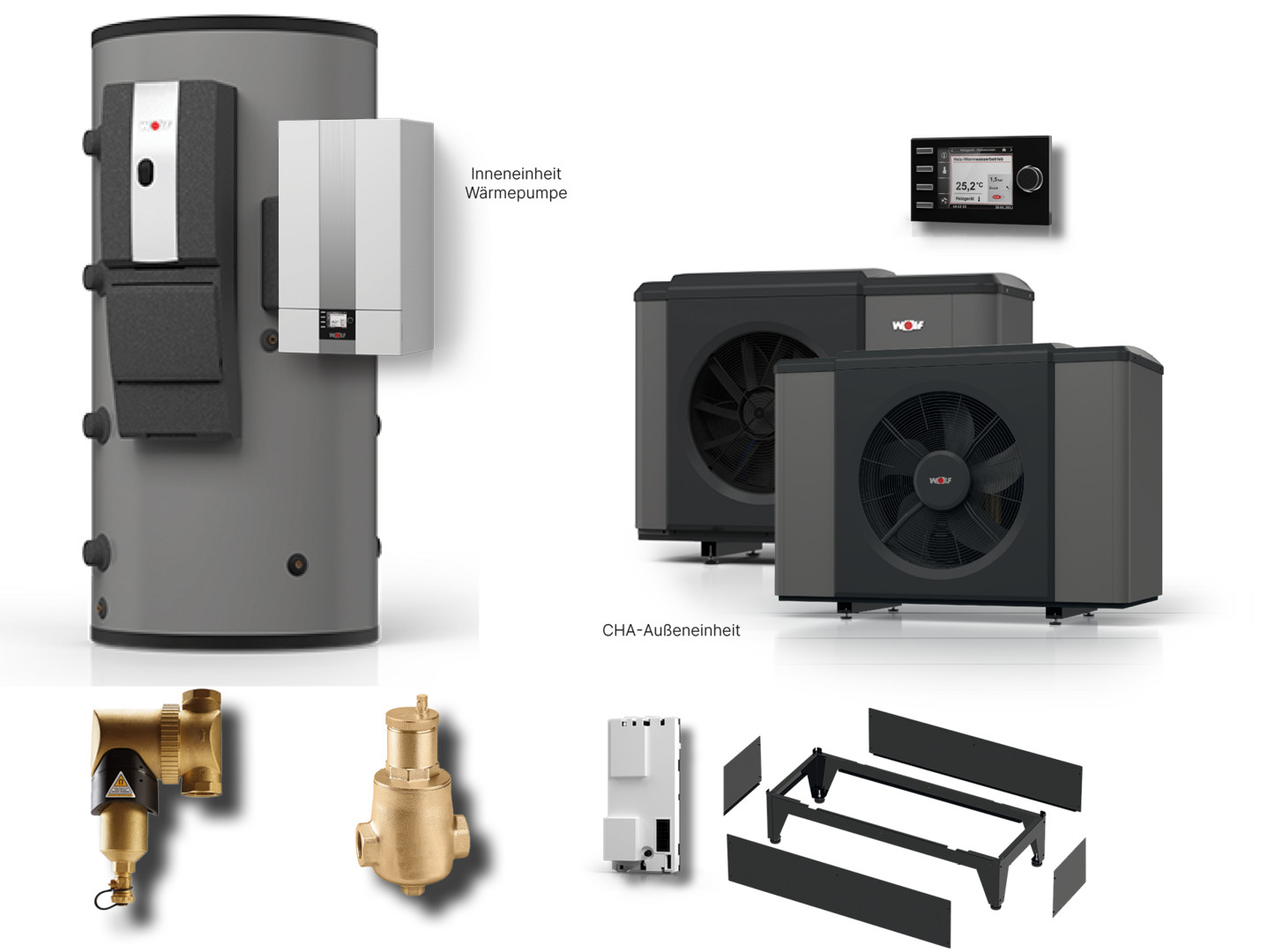 bestehend aus: Wärmepumpe CHA, Pufferspeicher, Warmwasserspeicher, drehbarer Schlammabscheider, mit Magnetitabscheider mit Wärmedämmung, Mikroblasenabscheider mit Wärmedämmung, Bedienmodul BM-2 mit Außenfühler, Bodenkonsole für CHA, Verkleidung für Bodenkonsole CHA, 2 x Speicherfühler