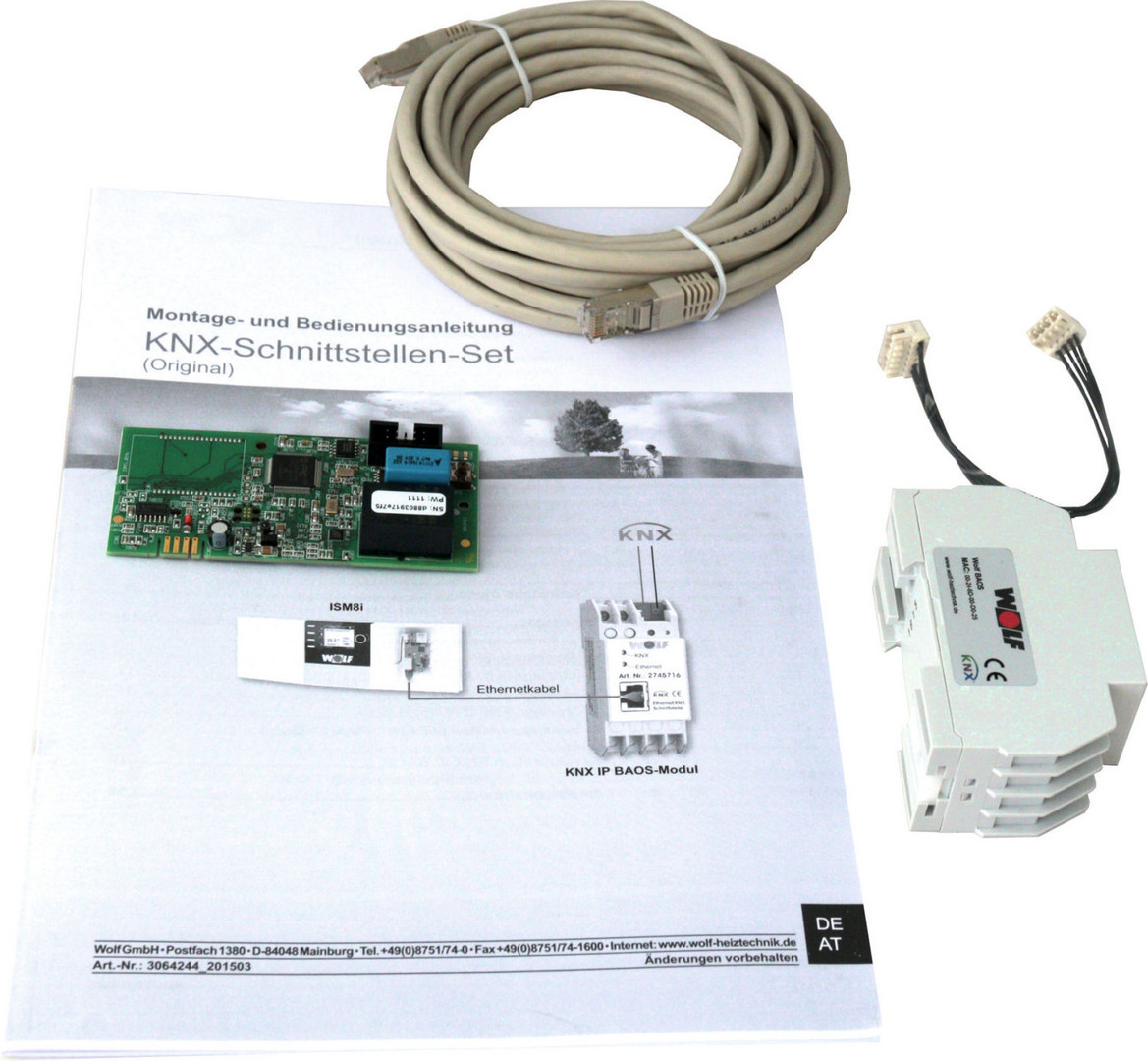 bestehend aus Schnittstellenmodul ISM8i Ethernet, KNX-IP-BAOS Modul, Montage-/Bedienungsanleitung und Netzwerkkabel, BM-2 im System erforderlich