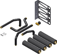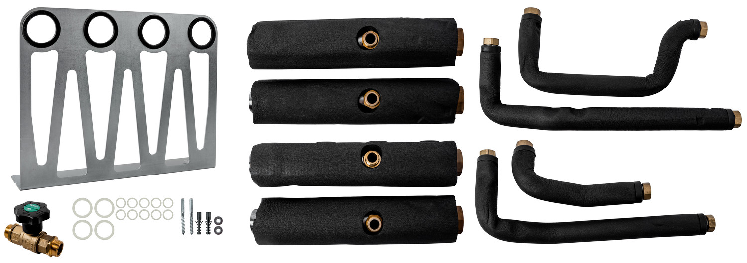 erweiterbares Set aus Edelstahlrohren DN 50, gedämmt mit Befestigungskonsole für Wandmontage, ein Set je FWS-2-80 bestehend aus: Sammlerrohren und Zuleitungen zu der Station, isoliert, Anschlussdimension DN50 (Edelstahl), mit Befestigungskonsole für einfache und schnelle Montage, DVGW Kugelhahn zur Montage am Warmwasseraustritt, je Kaskade ein Hygieneset notwendig.