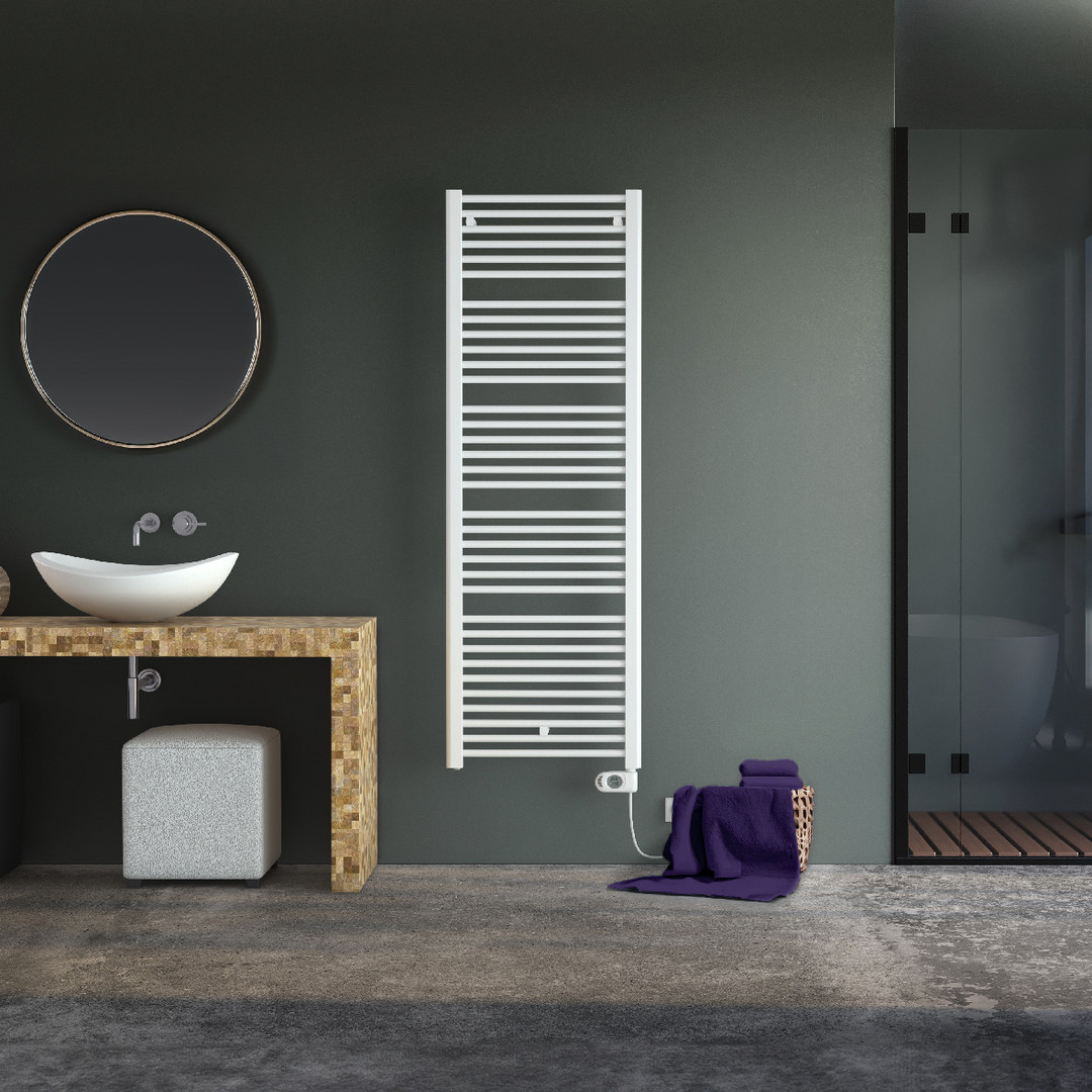 aus geraden horizontal angeordneten Rundrohren und vertikal verlaufenden Sammelrohren, Rohrverbindung gelötet ohne sichtbare Verbindungsnähte, Rundrohre mit Durchmesser 23 mm, Sammelrohre mit D-Profil 50 x 35 mm, mit eingebautem Heizstab und Elektronikeinheit Musa Eco in Weiß zur Regelung der Raumtemperatur, Schutzart IP44, spritzwassergeschützt, für Netzspannung 230 Volt, eingebaut unten rechts, Anschlusskabel 1,20 m lang, gefüllt mit Wärmeträgerflüssigkeit und fertiglackiert mit Pulverlackierung im Farbton RAL 9016