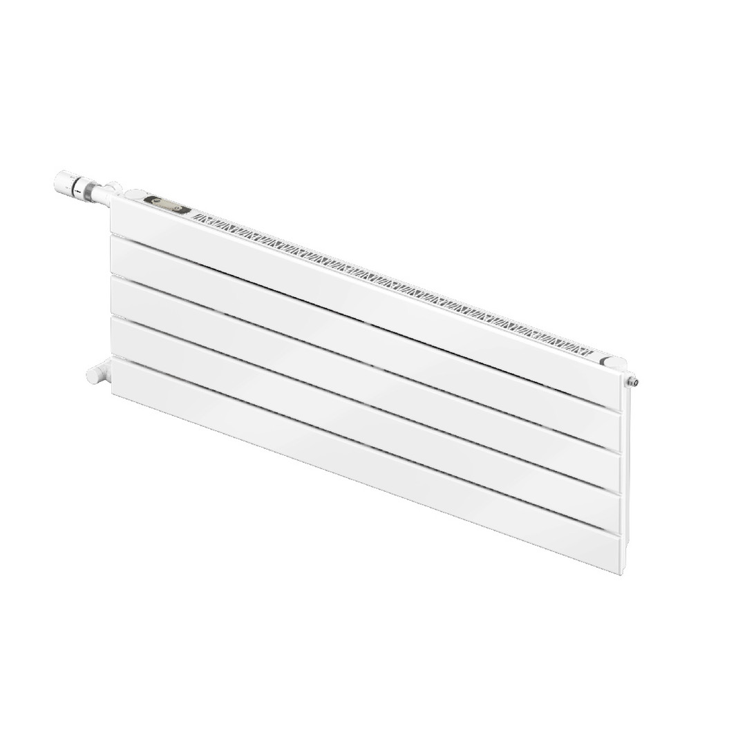Heizwand für den Einsatz im Niedertemperaturbereich, hoher Strahlungswärmeanteil, mit integriertem Lüfter, horizontale flachovale Profilrohre, mit 4 mm Abstand auf runde Sammelrohre geschweißt, Konvektionswärme wird über den hinter der Front liegenden Wärmetauscher abgegeben, Flachrohre 70 x 11 mm, Sammler aus Rundrohr Ø 38 mm, Betriebsüberdruck max. 4,0 bar, Betriebstemperatur max. 75 °C, Pulverbeschichtung nach DIN 55900, Wärme- und Kühlleistung geprüft nach EN 442 bzw. EN 16430, Schutzart IP24 (spritzwassergeschützt), Netzspannung 230 V, 2x 1/2"-Anschluss Innengewinde stirnseitig, 1/8"-Anschluss stirnseitig für Entlüftung, Entlüftungsventil 1/8", Anschlusskabel 1,20 m, Complettoanschluss mit integriertem Ventil von unten nach unten seitlich 50 mm links