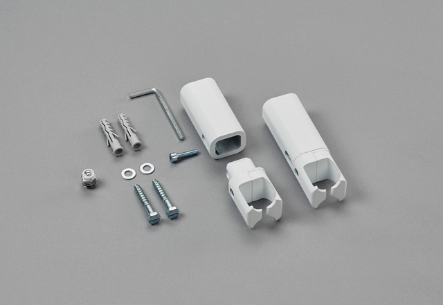 für Toga, 2x Wandkonsolen bestehend aus Wandhülse (88 mm), Schiebeteil, Klemmteil für D-Profil, Entlüftungsventil 1/4", Befestigungsmaterial, Montageanleitung, für Wandabstand 103 mm
