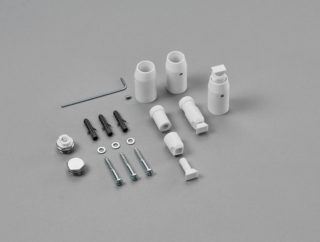 für Zeno einlagig, 3 Wandkonsolen mit Schrauben und Dübel, 1 Entlüftungsventil 1/2", 1 Blindstopfen 1/2", Montageanleitung
