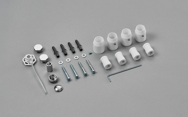 für Subway, 4 Wandkonsolen bestehend aus Wandhülse (40 mm) mit Gewindestift, Distanzstück (32 mm), 4 Kunststoffdübel 8 x 40 mm, 4 Sechskantschrauben mit Schlitz 6 x 50 mm, verzinkt, 4 Unterlegscheiben, verzinkt, 1 Innensechskant-Schlüssel SW 2,5 mm, 1 Design-Entlüftungsventil 1/2", 2 Blindstopfen 1/2", verchromt, 1 Entlüftungsschlüssel, Montageanleitung