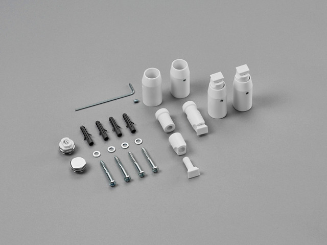 für Zeno Bow, 4 Wandkonsolen mit Schrauben und Dübel, 1 Entlüftungsventil 1/2", 1 Blindstopfen 1/2", Montageanleitung, für Heizkörper mit Mittelanschluss sind im Original-Lieferumfang des Heizkörpers zwei zusätzliche Bindstopfen enthalten