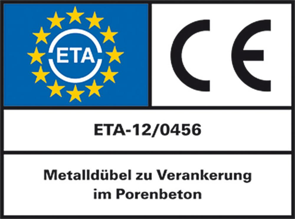 • Zugelassen für: Porenbeton der Druckfestigkeitsklasse 2–7 N/mm², Porenbetonwand- und -deckenplatten der Druckfestigkeit >= 3,3, beplanktes Porenbetonmauerwerk, z. B. verputzt, gefliest, tapeziert etc.