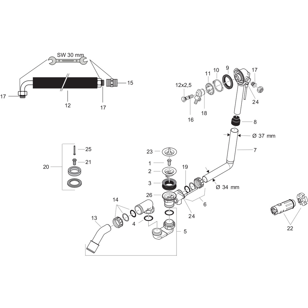 bestehend aus Grundkörper, Wannensiphon, mit Faltenbalg für Wannen mit schrägem Wannenrand, Bowdenzuglänge 780 mm, Geruchsverschluss, Stauwasserhöhe beträgt 50 mm, Wasseranschluss Zulaufschlauch links und rechts DN 20