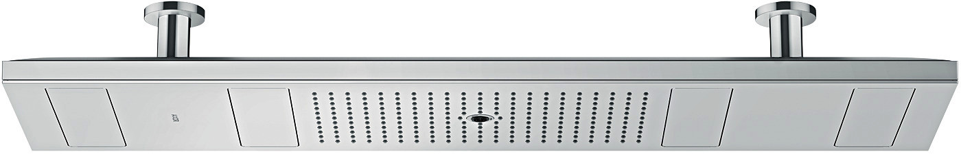 Brausekopfgröße 1200 x 300 mm, Strahlart: Rain, Mono, PowderRain, Select Umstellung an der Armatur, Material Strahlscheibe Metall, Metalldeckenanschluss, Deckenanschlusslänge 100 mm, max. Durchflussmenge bei 3 bar 30 l/min, Durchflussmenge Rain Strahl bei 3 bar 16 l/min, Durchflussmenge Mono Strahl bei 3 bar 14 l/min, Mindestfließdruck 3 bar, einzeln oder kombiniert ansteuerbar, Kopfbrause zur Reinigung abnehmbar, herausfahrbare Klappen können zur Reinigung manuell geöffnet werden, Deckenmontage, herausfahrbare Klappen sind voreinstellbar auf die Körpergröße, nicht für Durchlauferhitzer geeignet, Quick Clean Antikalksystem, Grundkörper ist nicht enthalte