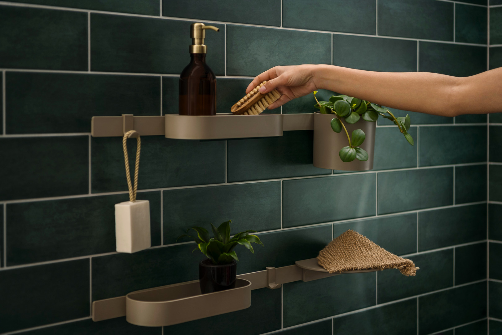 bestehend aus Befestigungsleiste und Dekoleiste, Wandmontage, geeignet zur horizontalen und vertikalen Installation, horizontale Installation geeignet für Brausestange, geeignet für Fliesen, Glas und Metall, Anwendung kleben oder bohren, mit Klebeset, Haltekraft 5 kg, Material Trägerleiste Metall, Material Dekoleiste Kunststoff, verdeckte Befestigung, Bohrabstand 312 mm
