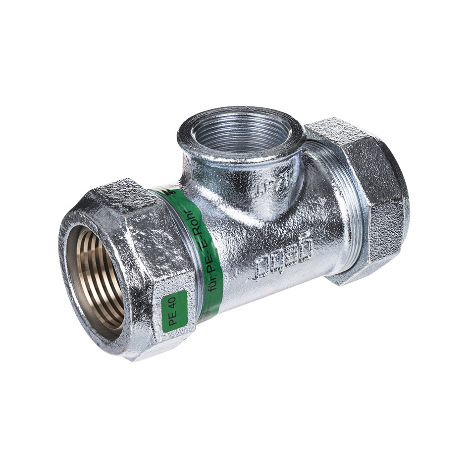 Temperguss-Klemmverbinder, beidseitig zum Klemmen, Abgang mit IG, für PE-Rohr: PE80, PE100, PE-Xa-Rohr nach DVGW-Arbeitsblatt GW 355 A2/A3 DIN 8074/75 und DIN EN 12201-2 und DIN 16893, 20-63 mm, Medien sind Wasser, Gas und Druckluft, Druckstufen bei Wasser PE80 und PE-Xa PN 12,5, PE100, PN 16, bei Gas PE80, PE100 und Pe-Xa PN 4 und bei Druckluft PE80, PE-Xa PN 10, PE100 PN 12,5, Prüfungen Wasser DIN 8076/DIN EN 10284, DVGW-Reg.-Nr. CW-7511CP0631, Gas DVGW Arbeitsblatt G 5600-1, DVGW-Reg.-Nr. DG-7521CP0412, der Einsatz von Stützhülsen ist notwendig