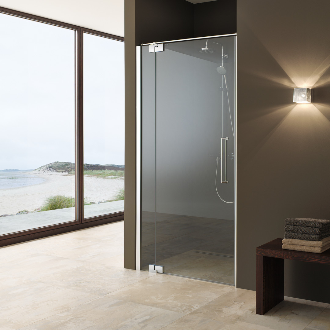 Glas 8 mm ESG, Standardhöhe 200 cm plus 3 cm Rundrohrbügel Ø 1,4 cm, Tür öffnet nach Innen und Außen, bodeneben, ohne Schwallschiene, PALM.fix, PALM.lift, PALM.free, PALM.pro, PALM.isi-clean, optional: PALM.nano, PALM.care, durchgehendes Wandbefestigungsprofil mit Verstellbereich