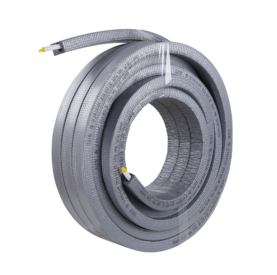 bestehend aus einer Innenschicht aus vernetztem Polyethylen (PE-Xb), einem längsseitig stumpfverschweißten Aluminiumrohr und einer Außenschicht aus Polyethylen mit erhöhter Temperaturbeständigkeit (PE-RT) zur Installation von Heizungssystemen, eingezogen in einer Rohrdämmung aus geschlossenzelligem PE-Weichschaum mit einer Wärmeleitgruppe 040, maximaler Dauerbetriebsdruck 10 bar, maximale Dauerbetriebstemperatur 95 °C