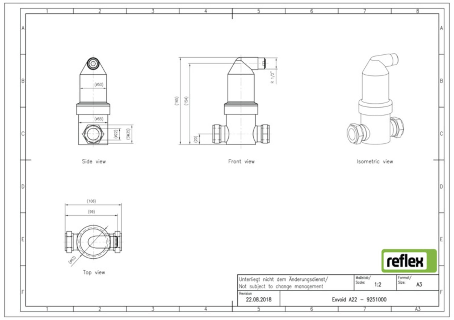 Reflex Mikroblasenabscheider Exvoid A 22, 22 mm, 110 GradC, 10 bar, horizontal, Messing W810787