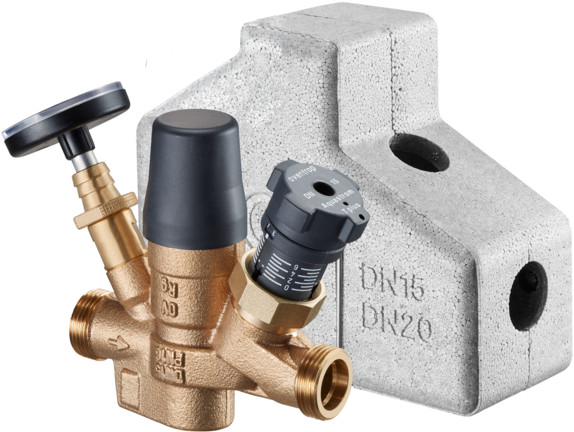 mit einstellbarem Temperatur-Regelbereich und festem Restvolumenstrom für Zirkulationsleitungen, Rotguss, absperrbar, voreinstellbar, Schlauchentleerung vor der thermischen Regeleinheit eingebaut mit Isolierung und Thermometer, für Trinkwasseranlagen PN 16 für Zirkulationsleitungen gem. Arbeitsblatt W551 und W553, Armatur entspricht DVGW W554, DVGW, KIWA, SVGW, ACS und VA zertifiziert, Wassertemperatur max. 90 °C, Thermische Regelung: empfohlener Regelbereich 55 °C-60 °C, voreingestellt auf 57 °C (max. Regelbereich 40 °C-65 °C), Temperatureinstellung gegen Verstellen sicherbar, automatische thermische Desinfektion, Desinfektionsbereich beginnt ca. 6K oberhalb der eingestellten Temperatur und reduziert ab ca. 73 °C den Desinfektionsvolumenstrom auf den Restvolumenstrom zur Sicherstellung der Desinfektion nachfolgender Anlagenteile, Entleerungsventil mit Schlauchaufnahme, durch Thermometer oder Temperaturfühler, Temperaturüberwachung möglich, max. Volumenstrom unabhängig von eingestellter Regeltemperatur voreinstellbar und absperrbar, Medienberührende Teile frei von Messing, komplett mit Isolierschalen aus EPS nach EnEV, Baustoffklasse B1 nach DIN 4102