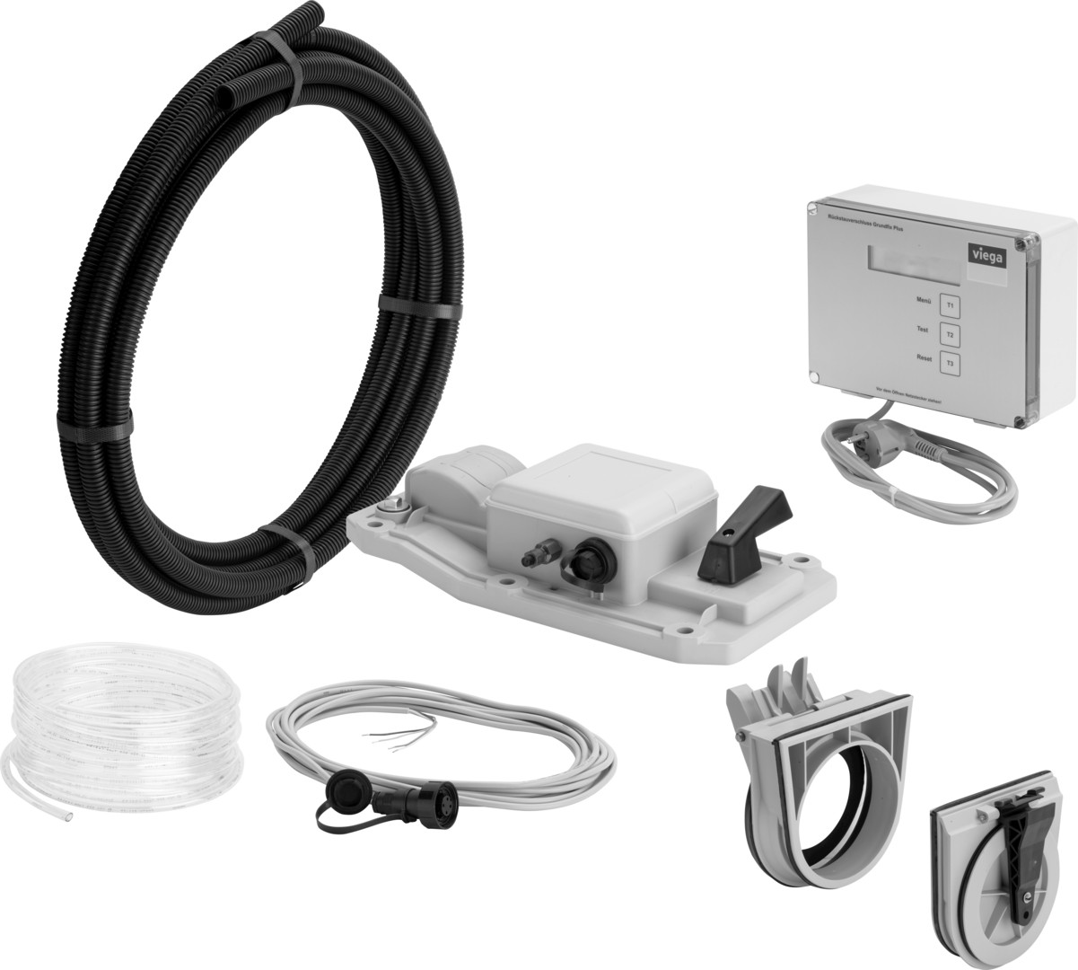 für Nachrüstung zum Grundfix Plus Control-Rückstauverschluss, geeignet für Grundfix-Rückstauverschluss Grundkörper (Reinigungsrohr) Modell 4987, Grundfix-Rückstauverschluss Typ 0 Modell 4987.1, Grundfix-Rückstauverschluss Typ 1 Modell 4987.2, Grundfix-Rückstauverschluss Typ 2 Modell 4987.3, mit Grundfix Plus Control-Steuer-/Meldeeinrichtung, Dreitasten-Bedienfeld mit LCD-Textanzeige, Selbsttest 24 h, Notstromversorgung durch Akku-Management, optisch/akustische Warnmeldung, Motorklappe, Rückstauklappe, Handbetätigung, Druckschlauch, Anschlusskabel, Leerrohr 8 m für Kabel und Druckschlauch, Prüfvorrichtung
