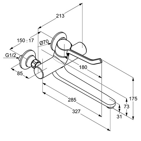 DN 15, wahlweise für KLINIK- oder PUBLIC-Hebel, Wandmontage, Durchflussmenge 7,6 l/min bei 3 bar, PCA Cara-Strahlregler M 24 x 1, Keramik-Kartusche mit Heißwasserbegrenzung, schwenkbarer oder arretierbarer Auslauf, S-Anschlüsse, 335310500/335330500/335370500 mit absperrbaren S-Anschlüssen, P-IX 19335/IZ