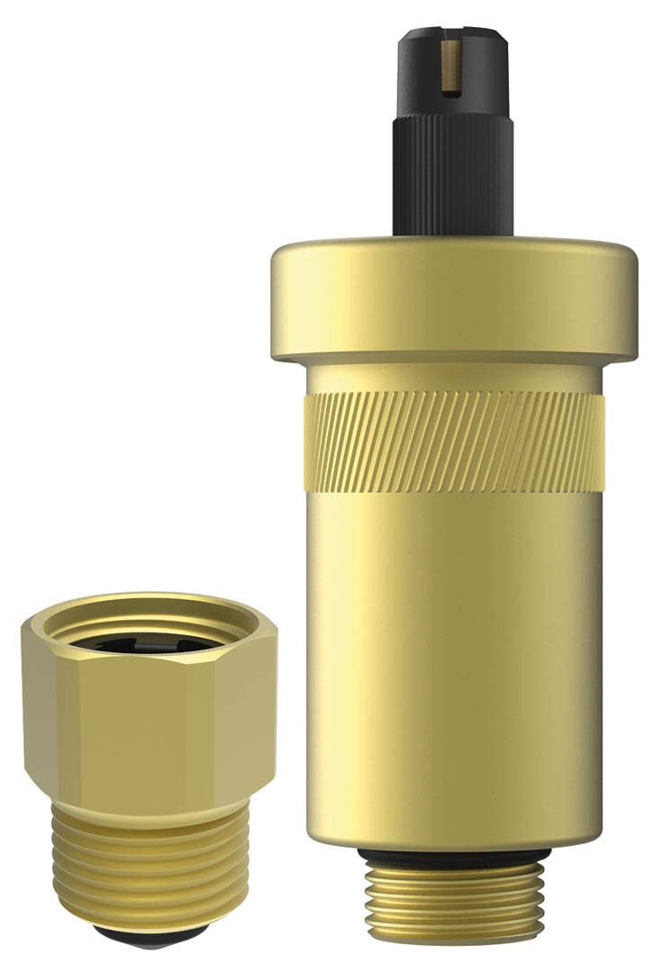 automatischer Schnellentlüfter mit Montageventil und Aquastop, Gehäuse aus Messing, Deckel aus glasfaserverstärktem Kunststoff, Überwürfschraubring aus Messing