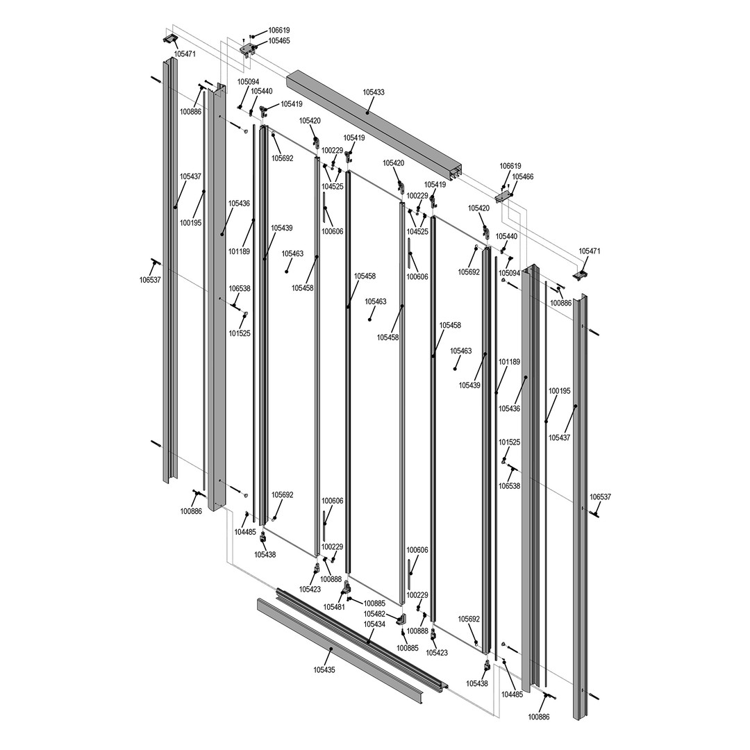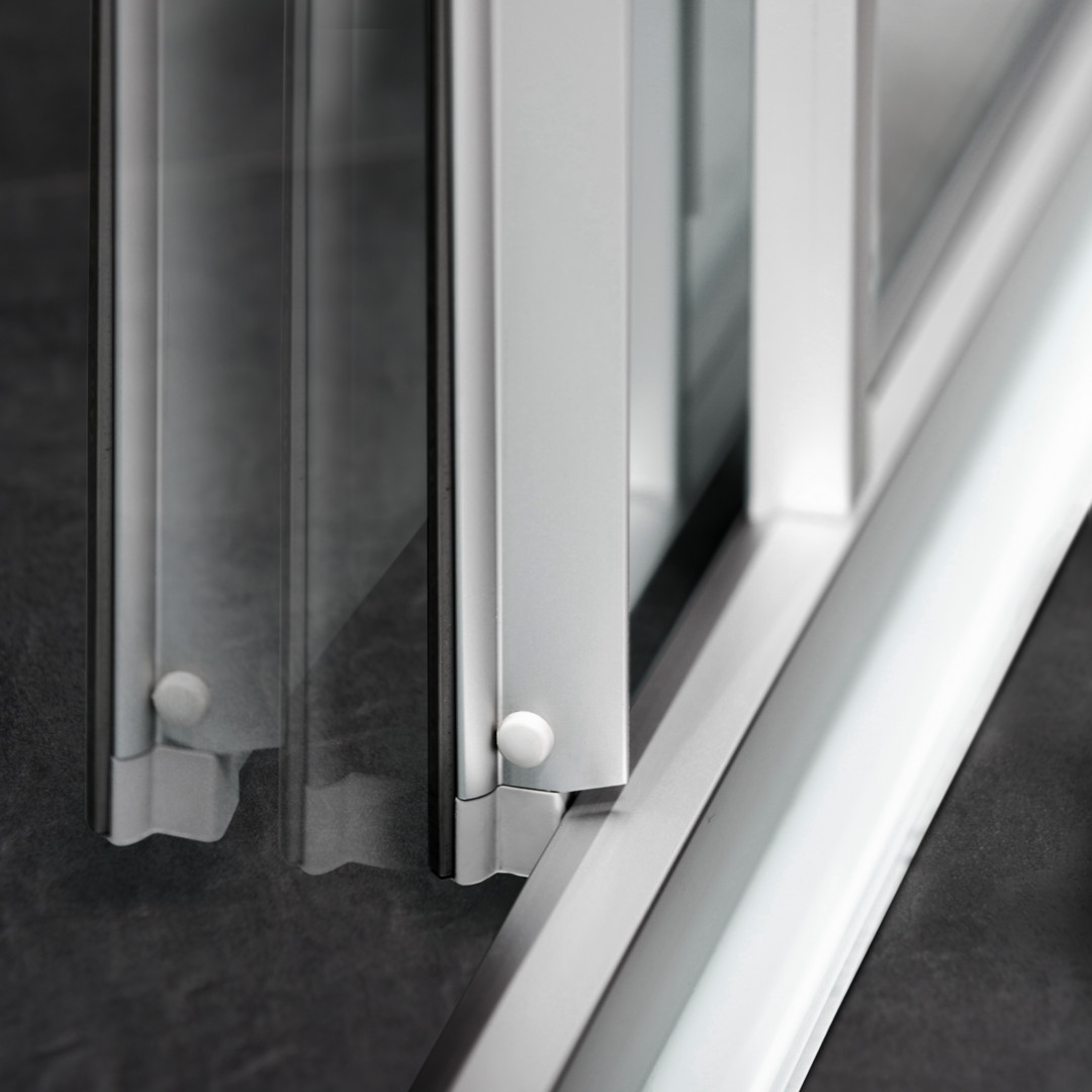 Glas 4 mm ESG transparent, Standardhöhe 2000 mm, mit Griffleiste, PALM.fix, PALM.magnet, PALM.isi-clean, optional PALM.nano, PALM.care, Bodenschiene 49 mm hoch, alle Türelemente zum Schieben