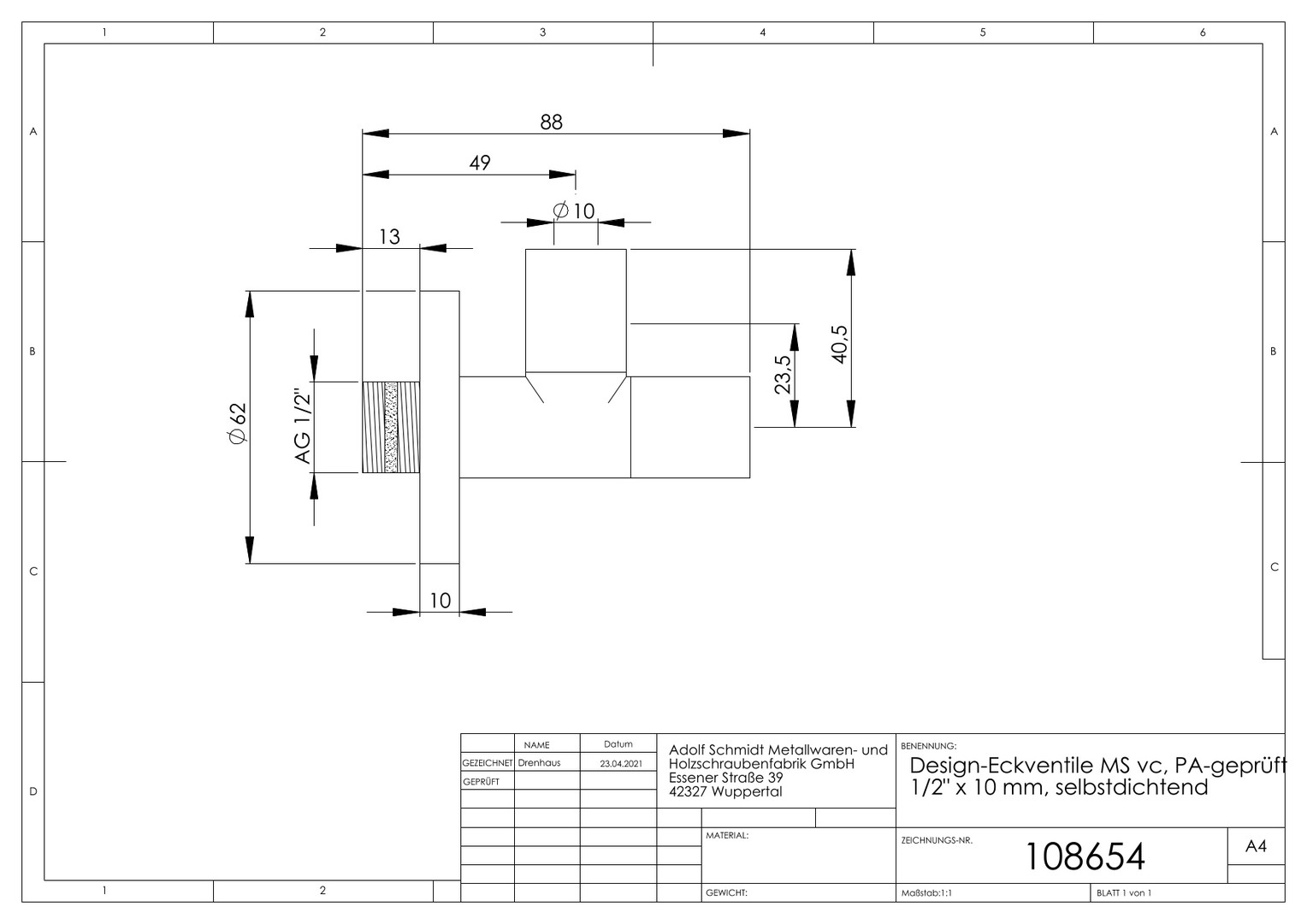 ASW Design-Eckventil 1/2" x 10 mm, selbstdichtend, Messing verchromt, PA-geprüft