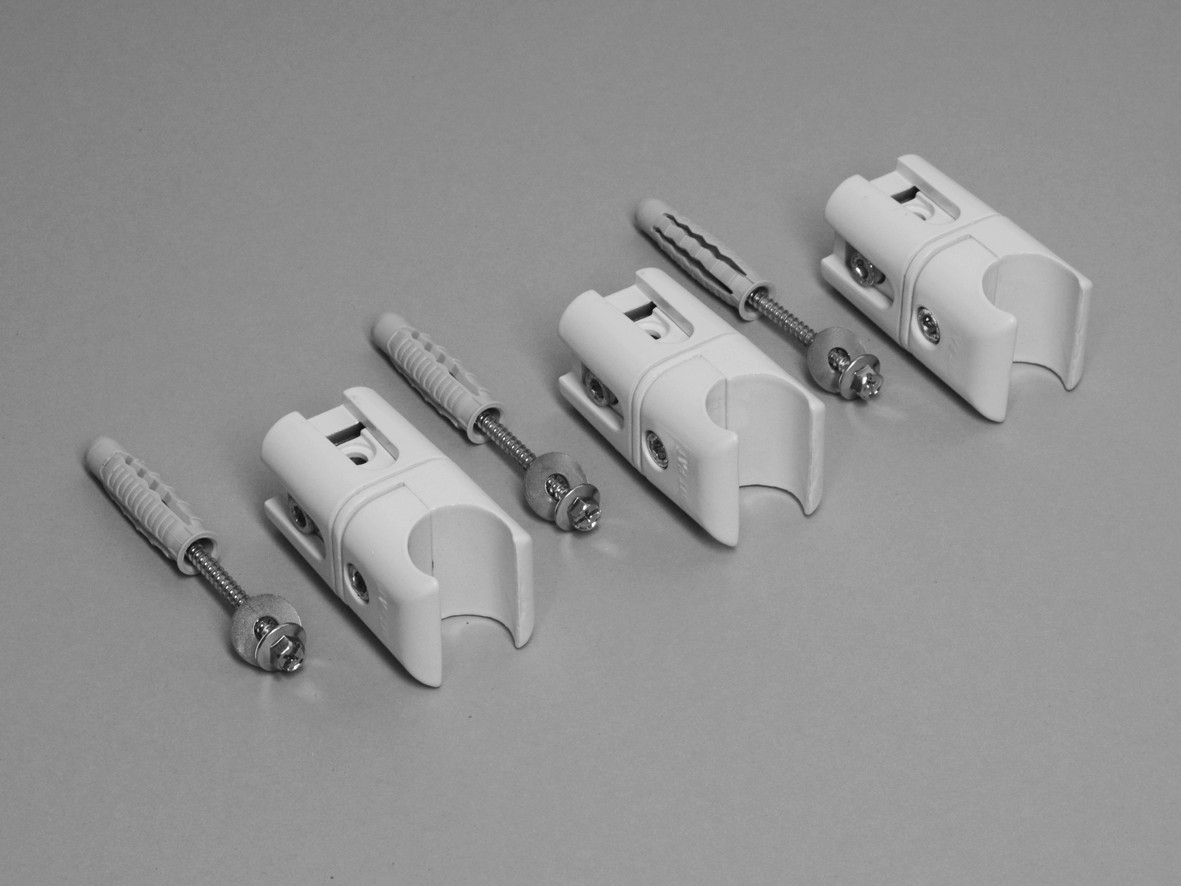 für Era und Krera ohne Befestigungslaschen, bestehend aus 3 Spezial-Halterungen aus Aluminium-Druckguß, für Rundrohr 25 mm, für lichten hinteren Wandabstand von ca. 50-60 mm, mit 3 Dübel 10 mm und 3 Holzschrauben