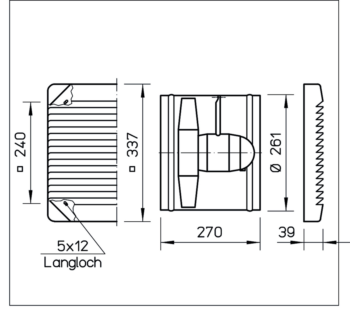 Gehäuse aus verzinktem Stahlblech, Laufrad mit profilierten Schaufeln aus Kunststoff, dynamisch ausgewuchtet, geschlossenes Aluminiumdruckguss-Gehäuse, Antrieb kugelgelagert (wartungs- und funkstörungsfrei, Wicklung mit Feuchtschutzimprägnierung, serienmäßiger Klemmkasten (Schutzart IP 54/55) an Motorrückseite, Schutzgitter aus Kunststoff (DIN EN ISWO 13857 entsprechend), Wendebetrieb mittels Wendeschalter reversierbar, Einbau in jeder Lage möglich (jedoch einsatzabhängig, evtl. Kondenswasserbohrungen beachten)