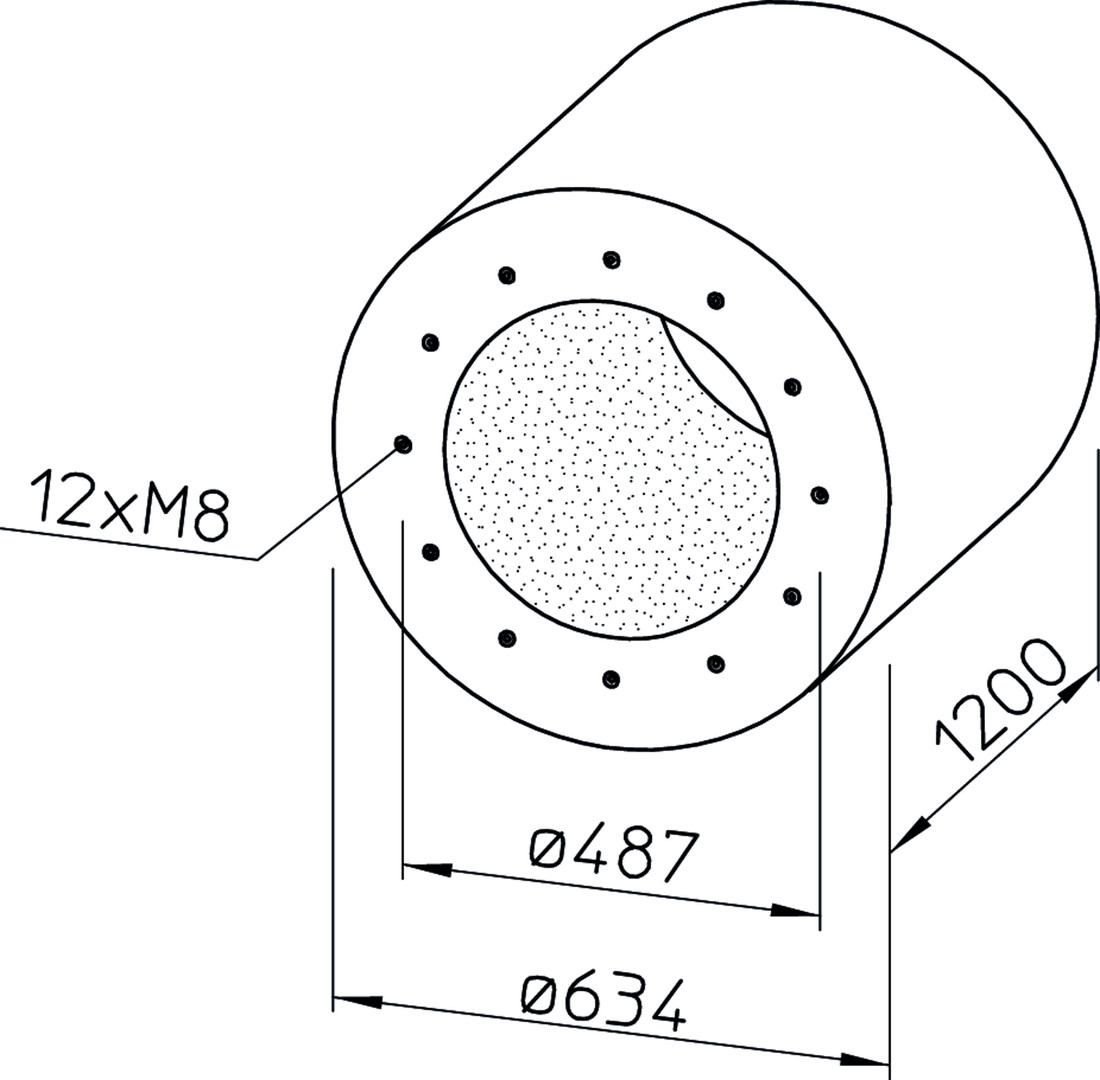 Auskleidung mit Mineralwolle (strömungsseitig mit einem Vlies gegen Abrieb ausgerüstet), Maße und Befestigungslochkreis aller Größen sind auf die Ventilatoren- Normdurchmesser (R 20) abgestimmt, Befestigungsbohrungen entsprechen DIN 24155-Bl. 2, für größere Einfügungsdämmungen können mehrere Schalldämpfer mit gleichem Durchmesser hintereinander angeordnet werden