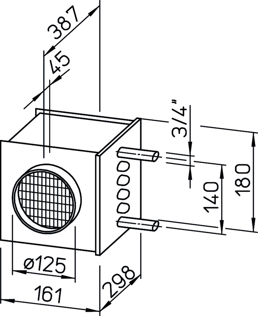 zum Rohrstrecken-Einbau, Gehäuse aus verzinktem Stahlblech mit beidseitigen Anschlüssen mit Gummi-Lippendichtung zum Einbau in Normrohre. Wärmetauscher: Kupfer-Rohre, aufgepressten Aluminium-Lamellen, Betriebstemperatur max. 100 °C, Betriebsdruck max. 8 bar