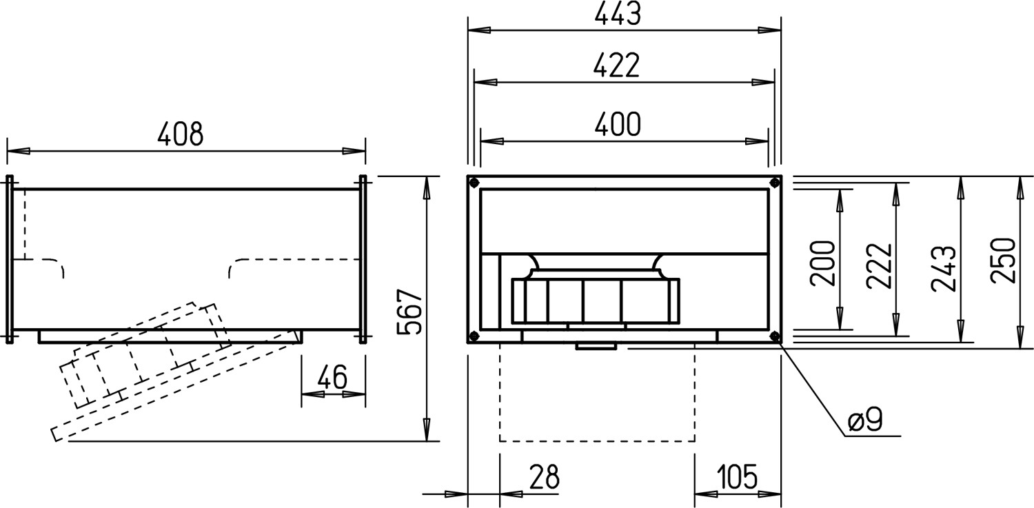 für Rechteck-Kanäle, Motor-Laufradeinheit ausschwenkbar, V= 540-14410 cbm, zur Förderung größerer Volumenströme in Ab- und Außenluftanlagen, unkritisch bei Förderung von verschmutzter Luft, Einbau in beliebiger Lage möglich-jedoch nur mit Revisionsklappe nach unten oder zur Seite, Gehäuse aus verzinktem Stahlblech und beidseitig mit Kanal-Flanschprofilen (20 mm) zum Einbau in Kanalverlauf, Schaufeln aus Kunststoff, drehzahlsteuerbarer EC-Außenläufermotor in Schutzart IP 44 (wartungs- und funkstörungsfrei, kugelgelagert), integrierte elektronische Temperaturüberwachung für EC-Motor und Elektronik, Klemmenkasten(IP 54) an ausgeführtem Kabel montiert