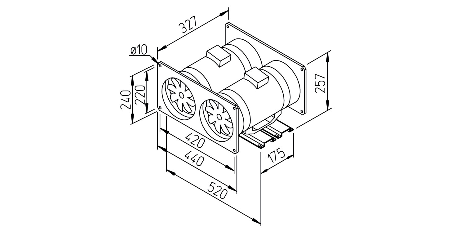speziell für direktes Zwischensetzen in Rohrsysteme, Anwendungen im Gewerbe-/Industrie- und Wohnbereich, Ansaug- und Ausblasstutzen entsprechen den Norm-Rohr-Ø, serienmäßig mit 2 Leistungsstufen (100%ig drehzahlsteuerbar), Montage in jeder Lage, Longlife-Kugellager (ausgelegt für 30000 Betriebsstunden), herausnehmbare Ventilatoreinheit mit Klemmenkasten in jede Position drehbar, integrierte Montagekonsole, Gehäuse aus schlag- und korrosionsfestem Kunststoff in hellgrau, 2 parallel angeordnete MV Ventilatoren werden durch saug- und druckseitig aufgesetzte Kanalanschlussplatten miteinander verbunden und mit Montageschienen verschraubt (Lieferung als fertiger Bausatz), jeder Ventilator ist mit einem eigenen Klemmenkasten außen am Gehäuse ausgestattet