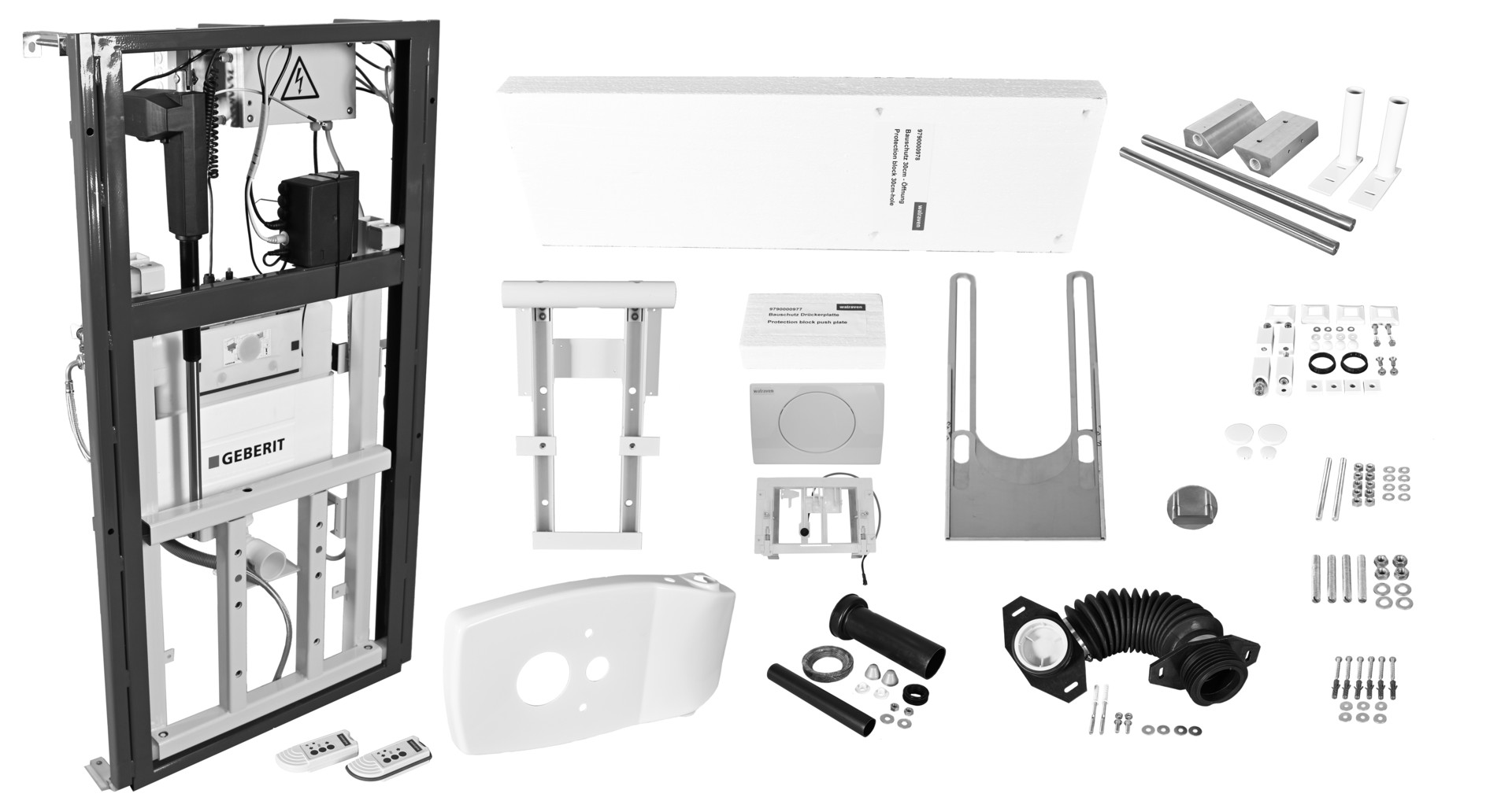 mit vormontiertem Geberit-Spülkasten, geeignet zum Einsatz in Kliniken, Reha-Zentren und Seniorenheimen, Ausführung wie Vario WC DeLuxe 30, jedoch mit beidseitigen Edelstahl-Führungswellen zur Aufnahme von barrierefreien Stützklappgriffen, getestet und entwickelt nach DIN 18030 und 33455, mit Betätigungsplatte Ellipse und Fernsteuerung für elektrische Höhenverstellung, barrierefreie Armstützen bewegen sich während der Höhenverstellung mit, individuell voneinander aufklappbar, mit Bedienfeld für Auf- und Abfahren, Spülung und Notruf, nach oben und unten abgefedert klappbar, geeignet für sowohl links- wie rechtshändigen Gebrauch