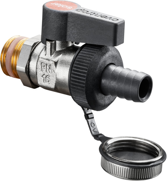 Oventrop KFE-Kugelhahn Optiflex Durchgang, für Solar, mit Schlauchverschraubung und Verschlusskappe, Messing vernickelt