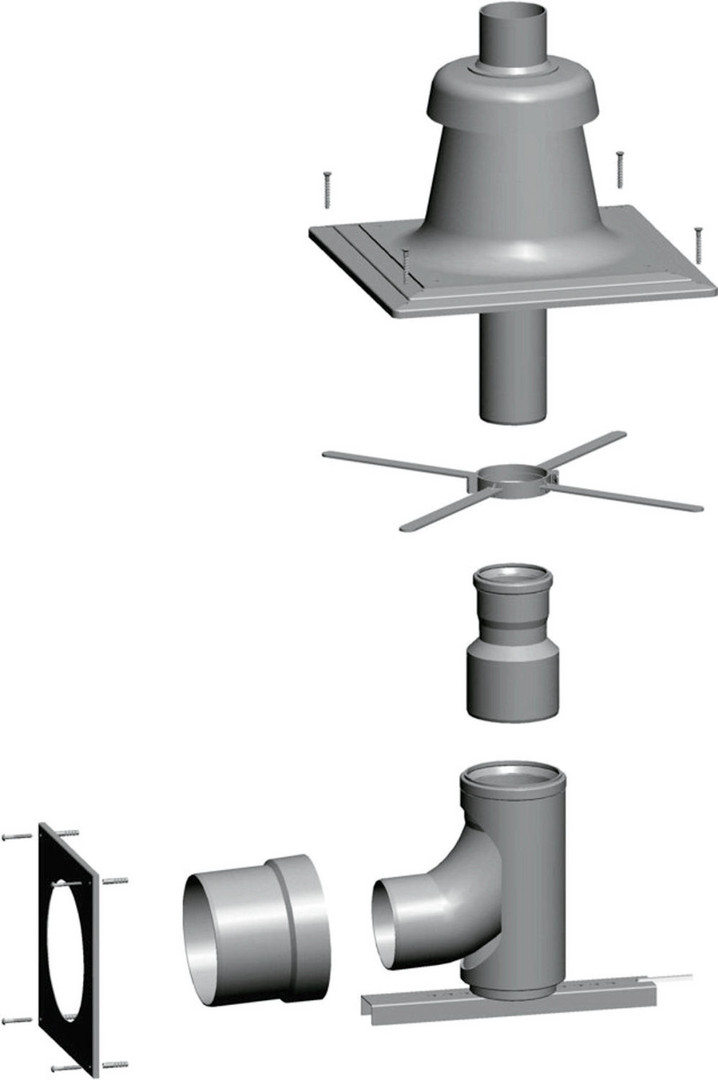 bestehend aus Schachtabdeckung DN 80 (Polypropylen) mit Mündungsrohr (Polypropylen, schwarz), 6 Abstandhalter DN 80 (Polypropylen), Reduzierung DN 110 auf Muffe DN 80 (Polypropylen), Stützbogen 87° DN 110 (Polypropylen) mit Abstützung, Wandfutter DN 110/160 (Edelstahl), Mauerblende DN 160 (Edelstahl) und Gleitmittel-Tube 50 ml. Rohrlängen sind je nach erforderlicher Höhe separat zu bestellen