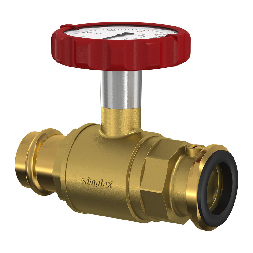 Kugel-Absperrarmatur für den Einsatz in Warmwasser- Heizungsanlagen, für saugseitigen Anbau an Umwälzpumpe, Pumpenanschluss mit Flansch für Pumpenverschraubung und integrierter Flachdichtung (Überwurfmutter nicht enthalten), voller Durchgang, rohrseitig mit Pressanschluss, verpressbar mit M- und V-Kontur, für Kupfer-, C-Stahl und Edelstahlrohre, mit integriertem Thermometer Ø 63 mm, Bauteile aus Messing vernickelt, Kugelhähne mit Pressanschluss aus Messing, Dichtmaterialien: EPDM/PTFE, max. Betriebstemperatur: 110 °C Dauertemperatur/130 °C kurzzeitig, max. Betriebsdruck 10 bar